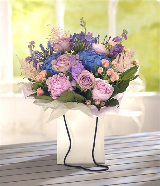 Get a WOW with this delightfully fragrant gift bag collection of hydraneas, agapnthus, roses, peonies and stocks.