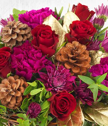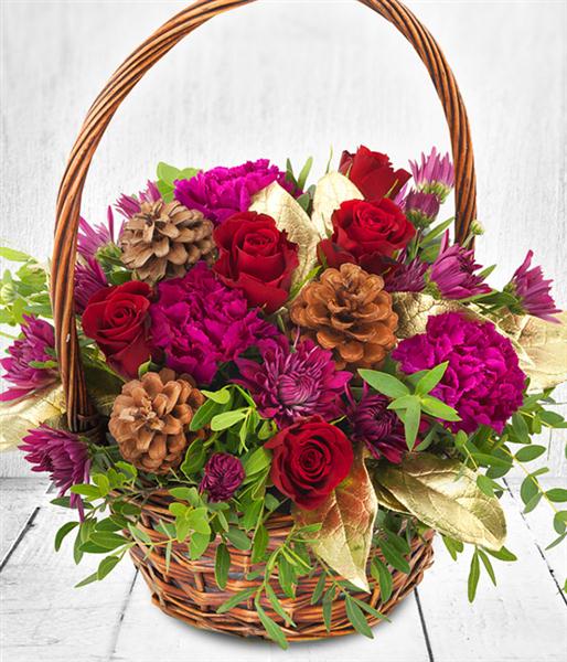 This basket of rich red roses, purple carnations and purple chrysanthemums is set off perfectly with gold foliage and pine cones for that festive feel.