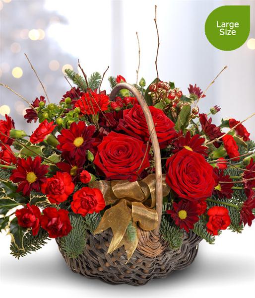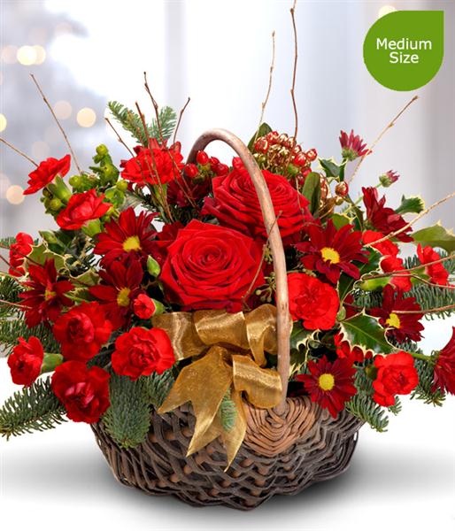 A gorgeous ruby red Christmas flower Basket bursting with Roses and Carnations. A flourish of Holly, Hypericum berry and Blue Spruce complete this seasonal arrangement perfectly.