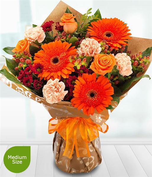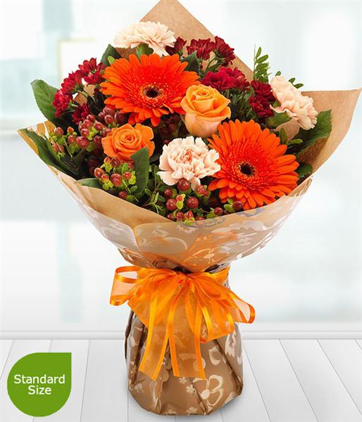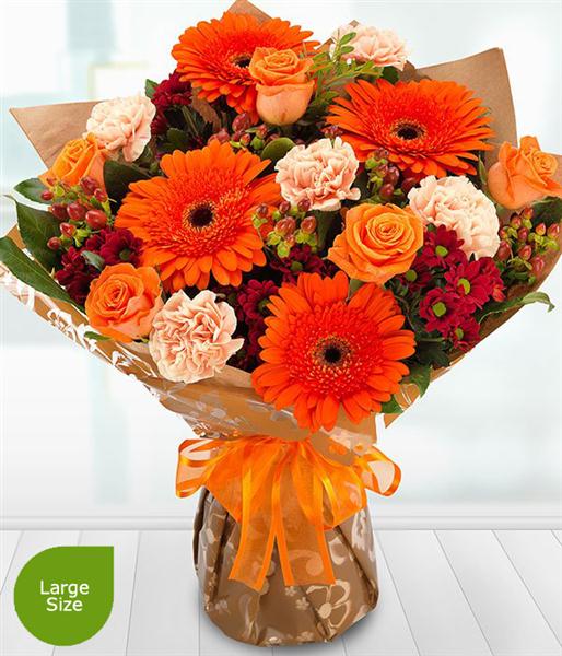 A superbly sumptuous and absolutely gorgeous aqua pack bouquet. Orange Roses and Gerberas sit amongst burgundy Spray Chrysanthemums and peach Carnations.