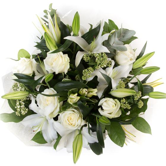 A fragrant hand-tied bouquet of oriental lilies and white roses mixed with eucalyptus.
