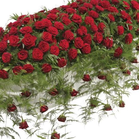 A luxurious red Rose casket spray. An abundance of gorgeous red Roses interspersed with Asparagus Fern and Palm leaves.