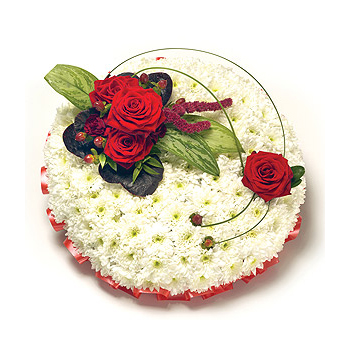 A white Chrysanthemum based posy with red ribbon edging, complete with red & green flower spray including Roses, Amaranthus & Hypericum. Size: 31cm (12").