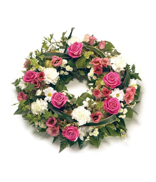 Open round wreath includes Roses, Carnations, Eustoma, Chrysanthemums with natural foliage edge. Size: Diameter - 36cm (14").
