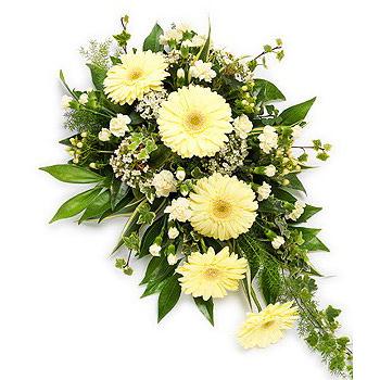 An elegant creamy white single ended spray. Yellow Gerbera, cream spray Carnations, Hypericums and white Viburnums are lovingly intertwined with variegated Dracaena, Foxtail Ferns, Cocculus and variegated Ivy.