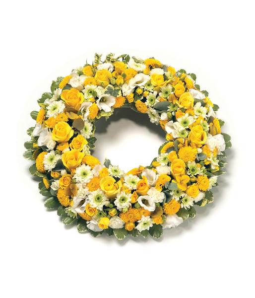 Yellow Roses, Yellow Spray Roses, Yellow Chrysanthemums, White Chrysanthemums, White Eustoma, White Spray Carnations, Eucalyptus, Pittosporum, Variegated Hedera.;